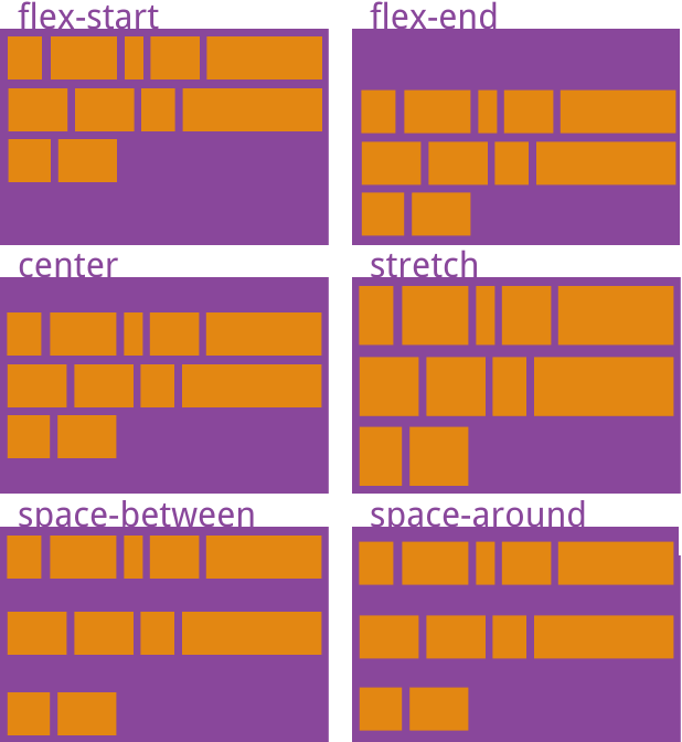 当 flex-wrap 配置了 wrap 时,可通过 align-content 来配置多根轴线在副轴的对齐方式。