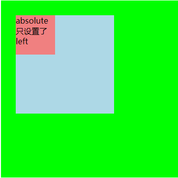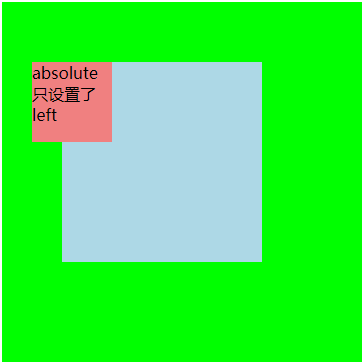 如果绝对定位元素只设置了 absolute,而没有设置坐标值时,则该元素没有脱离文档流,其位置依旧会被直接父元素所影响。下面示例中的绝对定位元素 .child 只设置了 left,所以其垂直方向没有脱离文档流,其位置依旧会受父元素位置的影响。