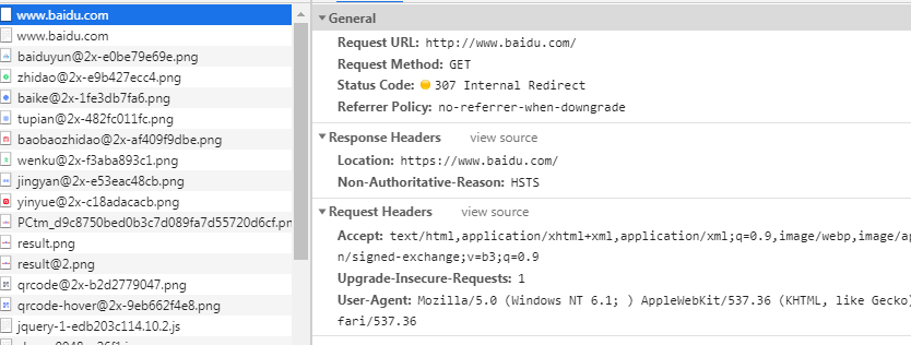 Chrome、Firefox等浏览器会产生一个307 Internal Redirect(内部跳转),自动跳转到HTTPS 请求。