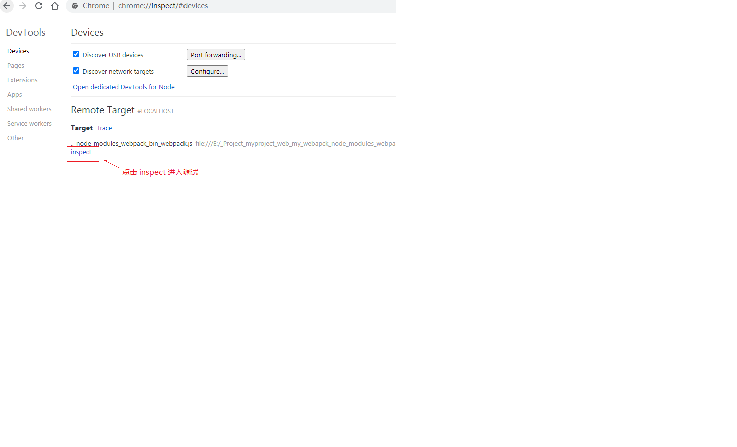 webpack 打包过程调试 发表于 2019-04-17 更新于 2020-09-14 分类于 web , webpack webpack 本质上是 node 应用,所以可以使用 node 调试方法对 webpack 打包过程进行调试: 进入项目目录,在控制台执行如下命令启动调试: 1node --inspect-brk .\node_modules\webpack\bin\webpack.js 在 chrome 地址栏输入 chrome://inspect/#devices 本文作者: DaMeng 本文链接: https://www.damengzhang.cn/web/webpack/webpack 打包过程调试/ 版权声明: 本博客所有文章除特别声明外,均采用 BY-NC-SA 许可协议。转载请注明出处!